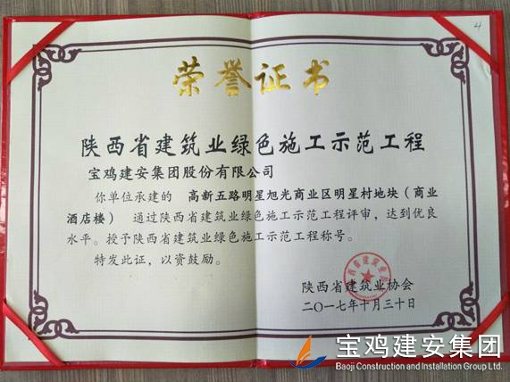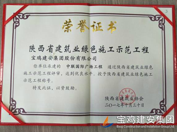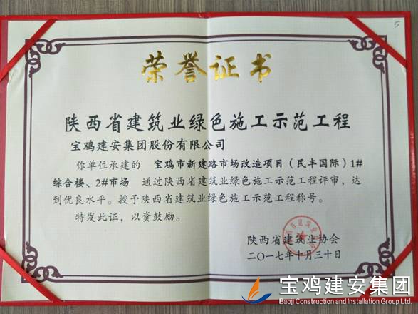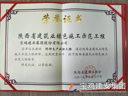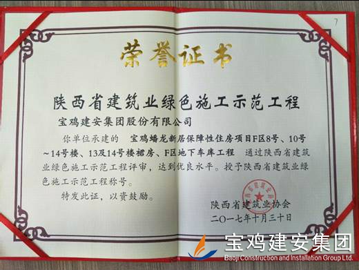 2018年1月26日在西安召開(kāi)了陜西省建筑業(yè)協(xié)會(huì)第六屆二次理事會(huì)議,我公司承建的科研生產(chǎn)試驗(yàn)大樓、寶雞蟠龍新居SF05標(biāo)段,高新五路明星佳苑、新建路市場(chǎng)改造項(xiàng)目(民豐國(guó)際)、中聯(lián)國(guó)際廣場(chǎng)項(xiàng)目,在2017年度綠色施工評(píng)審過(guò)程中,達(dá)到優(yōu)良水平,被授予陜西省建筑業(yè)綠色施工示范工程稱(chēng)號(hào)。
