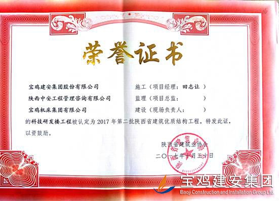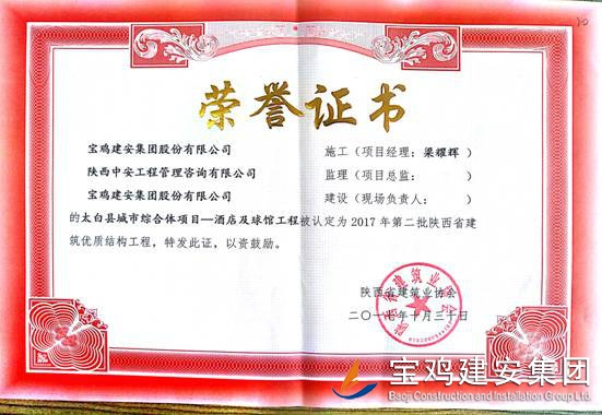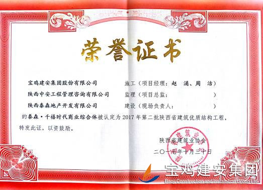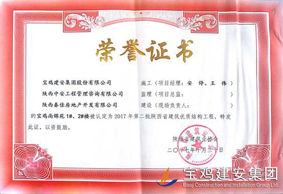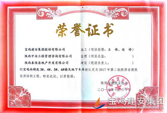 2018年1月26日從陜西省建筑業(yè)協(xié)會傳來喜訊,由寶雞建安集團股份有限公司負責施工的“科技研發(fā)樓工程”(五項目部)、“泰森?千禧時代商業(yè)綜合體”(六項目部)、“寶雞尚錦苑1#、2#樓”、“寶雞尚錦苑3#、4#、5#、6#樓及地下車庫”及“太白縣城市綜合體項目—酒店及球館工程”(路橋項目部)被陜西省建筑業(yè)協(xié)會評為2017年第二批陜西省優(yōu)質結構工程獎。