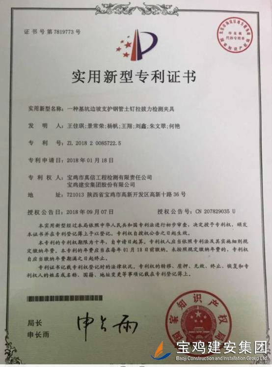 近日,由真信公司“楊帆創(chuàng)新工作室”自主研發(fā)的《一種基坑邊坡支護(hù)鋼管土釘拉拔力檢測(cè)夾具》獲得國(guó)家知識(shí)產(chǎn)權(quán)局批準(zhǔn),正式頒發(fā)實(shí)用新型專用證書!(專利號(hào):ZL 2018 2 0085722.5) 這是我們真信公司建司18年來,也是我們單位建室48年來,第一個(gè)國(guó)家級(jí)發(fā)明專利,具有里程碑的意義!真信公司長(zhǎng)期以來以“打造學(xué)習(xí)、創(chuàng)新型的團(tuán)隊(duì)”為目標(biāo),在日常的工程檢測(cè)工作中,不斷去探索、發(fā)現(xiàn)問題,及時(shí)的優(yōu)化,創(chuàng)新。 2017年9月,在公司的批準(zhǔn)及大力支持下,以楊帆同志命名的“楊帆創(chuàng)新工作室”正式成立了!工作室以“科學(xué)、嚴(yán)謹(jǐn)”為宗旨,以“解決日常檢測(cè)工作中遇到的頑疾,提高檢測(cè)工作效率及準(zhǔn)確性”為目標(biāo),正式投入到實(shí)用新型產(chǎn)品的研發(fā)之中。 土釘墻在工程中較多見,其主要是用于工程前期邊坡支護(hù)的工程,以防邊坡失穩(wěn)造成的邊坡塌方對(duì)人員生命財(cái)產(chǎn)安全及工程進(jìn)度造成損失。目前市場(chǎng)上檢測(cè)土釘?shù)睦蝺x和配套的夾具絕大部分是針對(duì)鋼筋土釘拉拔力設(shè)計(jì)的,而未涉及到鋼管土釘拉拔力專用夾具,從而未能對(duì)其進(jìn)行檢測(cè),以至于不能有效的將檢測(cè)數(shù)據(jù)反饋給建設(shè)單位及設(shè)計(jì)單位來進(jìn)行指導(dǎo)施工和結(jié)果評(píng)判。這個(gè)問題長(zhǎng)期以來困擾著廣大檢測(cè)工作者,給檢測(cè)工作及工程施工造成了諸多不良影響,創(chuàng)新,勢(shì)在必行! 作為工作室的首個(gè)研發(fā)項(xiàng)目,成員們克服日常工作任務(wù)繁重的困難,多次深入施工現(xiàn)場(chǎng),親身體會(huì),不斷地去嘗試,思索。在模具的制作過程中,為了讓產(chǎn)品更好的發(fā)揮出“實(shí)用型”的效果,工作室負(fù)責(zé)人楊帆同志多次前往加工車間,與技術(shù)人員緊密溝通,多次親自上手。回到單位,工作組即刻展開交流學(xué)習(xí),在電腦上反復(fù)的推敲、勾畫…… (寶雞真信工程檢測(cè)有限責(zé)任公司 秦建偉)