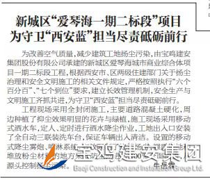 為改善空氣質(zhì)量,減少建筑工地?fù)P塵污染,由寶雞建安集團(tuán)股份有限公司承建的新城區(qū)愛琴海城市商業(yè)綜合體項目一期二標(biāo)段工程,根據(jù)西安市、區(qū)兩級住建部門關(guān)于揚塵治理和安全文明施工的相關(guān)文件規(guī)定,嚴(yán)格按照執(zhí)行“六個百分百”、“七個到位”要求,建立長效管理機(jī)制,安全生產(chǎn)與文明施工齊抓共進(jìn),為守衛(wèi)“西安藍(lán)”擔(dān)當(dāng)盡責(zé)砥礪前行。