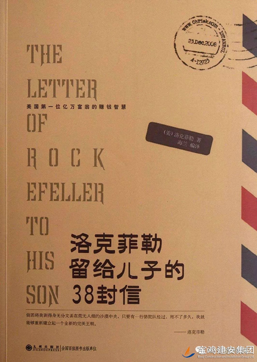單位:第八項目部 作者:張兆陽 中國有句古話:至樂莫若讀書,至要莫若教子。如何教育引導(dǎo)好年輕人,長久以來都是世界各個階級父母所關(guān)注的話題。洛克菲勒,標準石油公司創(chuàng)立者、全球首富。2009年福布斯公布“美國史上十五大富豪”,洛克菲勒名列榜首。這樣一個商業(yè)巨擘,同樣也在研究如何指引年輕一代。在這本書中,就淋漓盡致地呈現(xiàn)出了他對教育的見解。