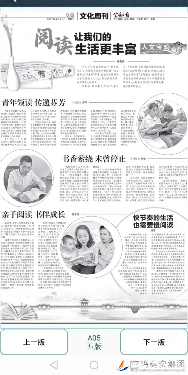 編者按:在第28個世界讀書日到來之際,《寶雞日報》社策劃了讀書專版,鑒于寶雞建安集團(tuán)工會長期堅持舉辦的“書香企業(yè)”征文活動在社會的影響力與美譽(yù)度,記者來電提出采訪意向,公司工會極力舉薦了來自基層一線熱愛閱讀并多次參與讀書征文的技術(shù)人員張振東同志。5月21日,《寶雞日報》發(fā)表了這篇小專訪,現(xiàn)予轉(zhuǎn)發(fā)。